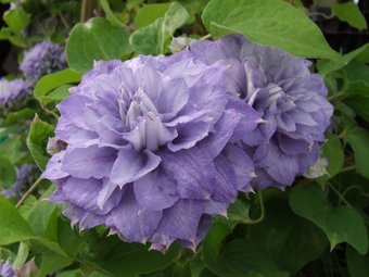 Описание Цветки голубые махровые крупные – диаметром 15-17 см. Цветет с июня по сентябрь на побегах текущего года. Достигает высоты 2-3 м. Цепляется за опоры листовыми черешками. Лучше растёт и цветёт на солнечных местах. Используется для выращивания у сеток, решёток и других садовых опор. Может плестись по натуральным опорам. | |