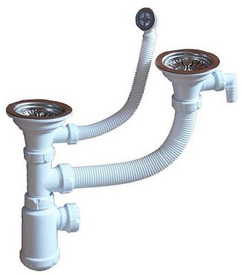 Описание ✅ Сифон для моек из искусственного камня на полторы/две чаши, круглый перелив, с отводом под посудомоечную машину, без гофрированной трубки. | |