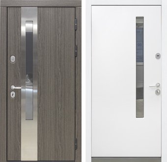 металл: 1.5 мм, открытые петли 3 шт., два замка (цилиндровый + сувальдный), отделка: МДФ плёночный (снаружи), МДФ плёночный (внутри)