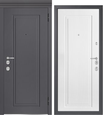 металл: 1.5 мм, открытые петли 2 шт., один замок, отделка: МДФ плёночный (снаружи), МДФ плёночный (внутри)