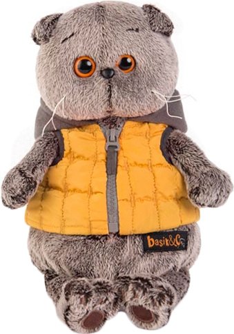 Описание Кот в оригинальном жилете цвета охры из стёганной плащёвки с серой отделкой по рукаву. Жилет сшит с флисовым капюшоном цвета муссон и серой тракторной молнией спереди. | |