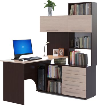 Описание Многофункциональный рабочий модуль для домашнего кабинета или офиса. Модель сочетает в себе широкий компьютерный стол с размером столешницы 1400 мм, тумбу с ящиками, полками и нишей под системный блок. Высокая надстройка имеет открытые полки и два закрытых шкафа. Двери шкафчиков открываются вверх. Внутренний размер ящиков — 456 х 346 мм. | |