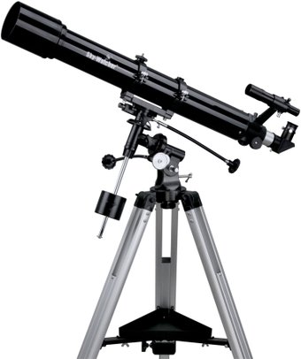 ахроматический рефрактор, диаметр: 90 мм, фокусное расстояние: 900 мм, относительное отверстие: 1/10, экваториальная (EQ) монтировка, окуляры 10 мм/25 мм