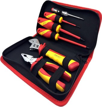 | Комплектация | 1. Список конфигурации продукта: 2. Индикаторная отвертка 125-250 В 3. Разводной ключ с изоляцией VDE, 8 дюймов 4. Клещи для проводов с изоляцией VDE, 6 дюймов 5. Отвертка Phillips с изоляцией VDE PH2х100 мм 6. Изолированная шлицевая отвертка VDE SL2.5х0.4х75 мм 7. Изолированная шлицевая отвертка VDE SL5.5х1х125 мм |