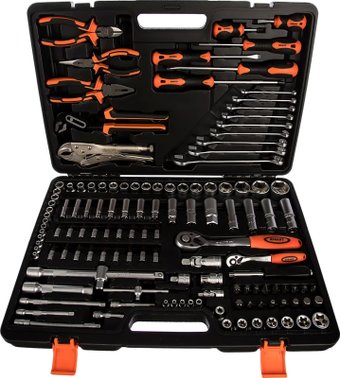 | Комплектация | - 1/4": Головки, 13 шт - 4, 4.5, 5, 5.5, 6, 7, 8, 9, 10, 11, 12, 13, 14 мм; 1/4" Удлинительные головки, 8 шт - 6, 7, 8, 9, 10, 11, 12, 13 Головки звездочкой, 5 шт - Е 4, 5, 6, 7, 8; Т-образный вороток с ползунком; Вороток; Удлинители, 4 шт - 50, 75, 100, 150 мм; Трещоточный ключ; Гибкий вал - 145 мм; Универсальный шарнир (карданчик); Биты под головку, 18 шт - 37 (L) Т 8, 10, 15, 20, 25, 27, 30; Н3, 4, 5, 6; Sl 4, 5.5, 6.5; Ph 1, 2, Pz 1, 2; Биты, 17 шт - 30 (L) Н7, 8, 10, 12, 14; Sl 8, 10, 12; Ph 3, 4; Pz 3, 4; Т 40, 45, 50, 55, 60. - 1/2": Головки Torx - Е 10, 11, 12, 14, 16, 18, 20, 24 мм; Свечные головки, 2 шт - 16, 21 мм; Удлинители, 2 шт - 125, 250 мм; Трещоточный ключ; Адаптер для бит; Универсальный шарнир (карданчик); 3-х сторонний адаптер; Головки, 17 шт - 8, 10, 11, 12, 13, 14, 15, 16, 17, 18, 19, 21, 22, 24, 27, 30, 32 мм; 1/2" Удлинительные головки, 4 шт - 14, 15, 17, 19 мм - Шестигранные ключи, 3 шт - 1.5, 2, 2.5 мм; - Зажимные плоскогубцы - 10"; - Бокорезы; - Шлицевые отверток, 3 шт - 6.5х38 мм, 6.5х100 мм, 8х150 мм; - Длинногубцы; - Крестовые отвертки, 3 шт - Ph2х38, Ph2х100, Ph3х150 мм; - Комбинированные ключи, 9 шт - 8, 10, 11, 12, 13, 14, 17, 19, 22 мм; - Переставные клещи - 10"; - Комбинированные плоскогубцы; - Свечная головка (3/8") 1 шт - 14 - Переходник 1/2" - 3/8" 1 шт - Кейс. |