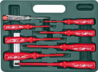 | Комплектация | - Отвертки шлицевые, SL, 4 шт.: SL0,4х2,5х85, SL0,8-х4,0х100, SL1,0х5,5х125, SL1,2х6,5х150; - Отвертки крестовые, PH, 3 шт.: PH0х75, PH1х100, PH2х200; - Отвертка-тестер; - Пластиковый кейс. |