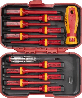 | Комплектация | - Диэлектрическая бита: шлиц 3.0x100 - Диэлектрическая бита: шлиц 4.0x100 - Диэлектрическая бита: шлиц 5.5x100 - Диэлектрическая бита: шлиц 6.5x100 - Диэлектрическая бита: PH 1x80 - Диэлектрическая бита: PH 2x100 - Диэлектрическая бита: PZ 1x80 - Диэлектрическая бита: PZ 2x100 - Диэлектрическая бита: Т10x100 - Диэлектрическая бита: Т15x100 - Диэлектрическая бита: Т20x100 - Тестер напряжения 110–250 В - Диэлектрическая рукоятка для сменных бит |