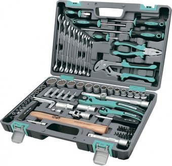 | Комплектация | Ключ трещоточный 1/2. Ключ трещоточный 1/4. Головки торцевые 1/2: 10, 11, 12, 13, 14, 15, 17, 19, 22, 24, 27, 30, 32. Головки торцевые 1/4: 4, 5, 6, 7, 8, 9, 10, 11, 12, 13. Головки торцевые 1/4, удлиненные: 5, 6, 7, 8, 9. Ключи комбинированные: 10, 11, 12, 13, 14, 15, 17, 19. Кардан 1/2. Кардан 1/4. Удлинитель 1/2. Удлинитель 1/4. Отвертка-держатель 1/4. Переходник для бит 1/4. Набор шестигранных ключей: 1.5 мм, 2.0 мм, 3 мм, 3.5 мм, 5 мм, 6 мм, 7 мм. Головки свечные 16 мм и 21 мм. Вороток Т-образный 1/2. Биты: Т10, Т15, Т20, Т25, Т27, Т30, T40, SL3, SL4, SL5, SL6, PH1, PH2, PH3. Пассатижи. Клещи переставные. Молоток, масса головки 0,3 кг. Отвертки: SL6 x 100; SL6,5 x 38, PH2x38; PH2 x 100; PH3 x 200. |