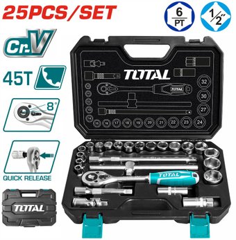 | Комплектация | Трещотка 1/2" 45T - 1 шт. Тоцевые головоки 1/2" (10, 11, 12, 13, 14, 15, 16, 17, 18, 19, 20, 21, 22, 23, 24, 27, 30, 32 мм) - 18 шт. Свечные головки 1/2" (16 мм и 21 мм) - 2 шт. Универсальный шарнир 1/2 дюйма - 1 шт. Удлинитель 1/2" (125 мм) - 1 шт. Удлинитель 1/2" (250 мм) - 1 шт. Вороток T-образный с бегунком 1/2" (250 мм) - 1 шт. Кейс |
