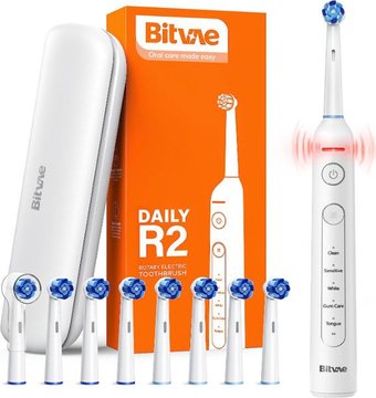 зубная щетка, мягкая чистка/отбеливание/массаж/чистка языка, питание от аккумулятора, движение головки: вращение, в комплекте: футляр, колпачок для насадки, USB-кабель, количество насадок: 8