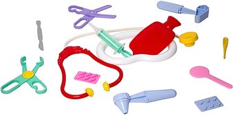 | Состав набора | ножницы (1 шт), шприц (1 шт), стетоскоп (1 шт), молоточек (1 шт), щипцы (1 шт), скальпель (1 шт), градусник (1 шт), лопатка (1 шт), ларингоскоп (1 шт), таблетки (2 шт), ванночка для медицинских инструментов (1 шт), грелка (1 шт) |