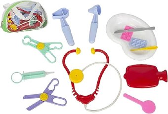 | Состав набора | ножницы (1 шт), шприц (1 шт), стетоскоп (1 шт), молоточек (1 шт), щипцы (1 шт), скальпель (1 шт), градусник (1 шт), лопатка (1 шт), ларингоскоп (1 шт), таблетки (2 шт), ванночка для медицинских инструментов (1 шт), грелка (1 шт) |