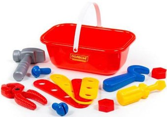 Набор для мальчиков состоит из отвертки, гаечного ключа, пассатижей, молотка, а также соединительных пластин, винтов и гаек. Набор укомплектован в корзинку, которая обеспечивает удобство перемещения. Он отлично подойдет для первого знакомства мальчика со слесарным инструментом, его назначением, принципами работы. Укомплектован в корзинку, которая упрощает перемещение игрушки.