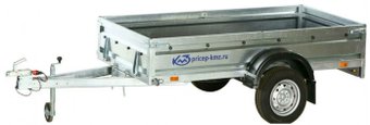 одноосный, полная масса 750 кг, рессорная подвеска, колеса R13, быстросъемный борт, размеры платформы 250x125 см, борт 35 см