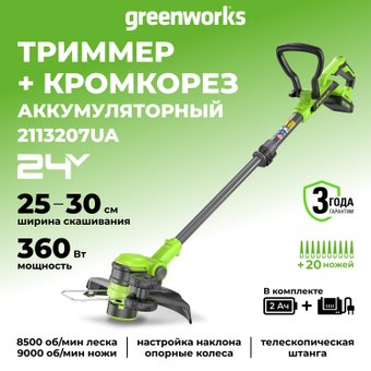Описание ✅ Триммер Greenworks G24LT301 24V 2113207 — это идеальный аккумуляторный инструмент для скашивания травы на небольших садовых участках. С шириной кошения 30 см с леской и 25 см с пластиковыми ножами, он отлично справляется с задачами в труднодоступных местах, где газонокосилка не сможет проехать. | |