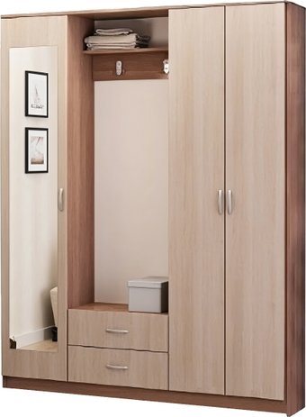 Описание Шкаф с зеркалом и вешалкой комбинированный для прихожей ПВ-2. Ящики на роликовых направляющих. Совместим со всеми элементами прихожей ПЛ. | |