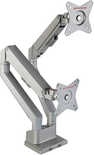 кронштейн для монитора, 17-34", 2 монитора, настольный, с регулировкой поворота, с регулировкой высоты, с кабель-каналом, струбцинное крепление, наклон 45°, поворот 360°, регулировка высоты 215-495 мм, цвет серебристый