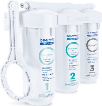 Описание Вкусная чистая вода без накипи! Классический 3-х ступенчатый фильтр с картриджами стандарта SlimLine 10’’ для доочистки очень жёсткой городской воды. Благодаря увеличенному количеству умягчающей смолы в составе, БАРЬЕР ПРОФИ Жесткость х2 удаляет накипь значительно дольше, чем аналоги. | |