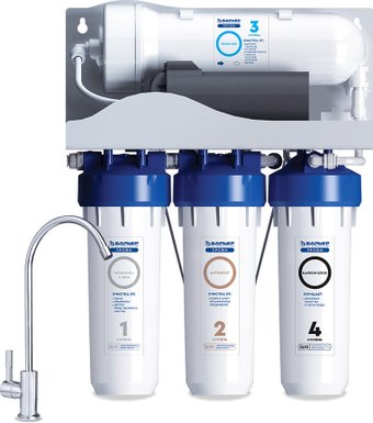 система обратного осмоса, производительность: 1.6 л/мин, ресурс: 10000 л, количество картриджей: 4, насос повышения давления